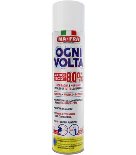 uno prodotto spray igienizzante secco istantaneo per purificare labitacolo auto, grandi ambienti come casa e uffici, il tutto senza bisogno di risciacquare le superfici trattate. Spray igienizzante ad ampio spettro. Alcool Secco 80. Prodotto dermatologicamente testato. La sua innovativa valvola 2in1 a 360 permette due tipologie di erogazione prodotto - spray per igienizzare oggetti. - auto svuotante per purificare gli ambienti. Bomboletta 300 ml. ...