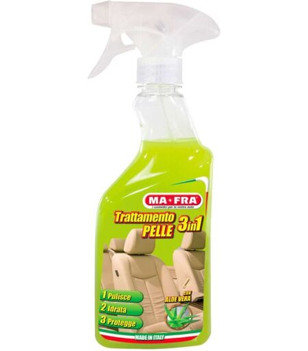 Ideale per pulire gli interni in pelle della tua auto. Pulisce tramite lazione detergente. Idrata grazie alle propriet dellAloe vera. Protegge prevenendo linvecchiamento veloce prevenendo la formazione di grinze e screpolature, mantenendo e ravvivando i sedili in pelle e tutti gli inserti della macchina, rilasciando anche un gradevole aroma nellabitacolo. Flacone spray 500 ml. ...