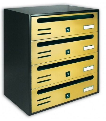 CASSETTE POSTALI Mod. CUBO/R corpo in lamiera elettrozincata, sportelli in alluminio. Colore oro. Serratura a cilindro con due chiavi. Art. C 4 R/O mm. 385 x 250 x 430 h. CASSETTE POSTALI Mod. CUBO/R corpo in lamiera elettrozincata, sportelli in alluminio. Colore oro. Serratura a cilindro con due chiavi. Art. C 4 R/O mm. 385 x 250 x 430 h. Per le isole minori ( escluse Sicilia e Sardegna) e laguna veneta, è previsto un supplemento riguardo il costo del trasporto da richiedere prima di effettuare l’ordine. ...