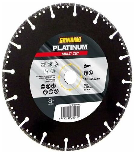 Mod. PLATINUM MULTI CUT progettati con uno strato di diamante. Per il taglio di materiali da costruzione, ghisa, ferro, cemento, PVC, vetroresina, legno. Corona con asole di sfogo. Foro 22,2 mm Dimensioni mm 115x2,5 ...