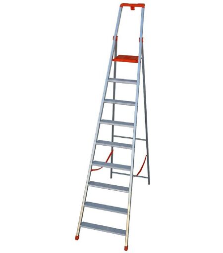 DESCRIZIONE GENERALE Scala professionale in tubolare di alluminio per uso professionale e domestico, con 10 gradini e piattaforma. Altezza ultimo gradino 228 cm, altezza raggiungibile 408 cm, altezza chiusa 312 cm. SPECIFICHE TECNICHE Montanti anteriori: 24 x 50 mm Montanti posteriori: 20 x 40 mm Gradini antiscivolo: larghezza 85 mm, profondità 110 mm Portata massima: 150 kg A norme europee: EN 131 Peso: 12,0 kg Dimensioni aperta: 65 x 184 x h 288 cm Altezza a forbice: 288 cm Altezza di lavoro utile: 408 cm Distanza piattaforma portautensili: 60 cm Dimensioni portautensili: 320 x 145 mm Spessore chiusa: 14 cm ...