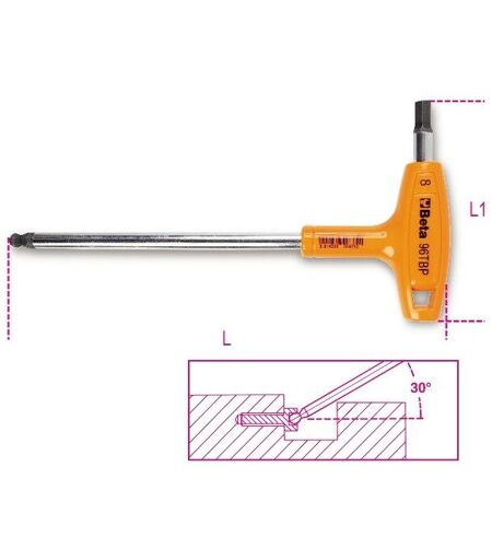 Prestazioni superiori ai modelli tradizionali a profilo completamente esagonale L'estremità sferica consente di operare con un'inclinazione fino a 30° rispetto all'asse della vite Per il serraggio, ove possibile, utilizzare il lato corto L'accurato proporzionamento dell'impugnatura ergonomica, in funzione della dimensione della chiave, garantisce serraggi elevati anche in spazi ristretti ...