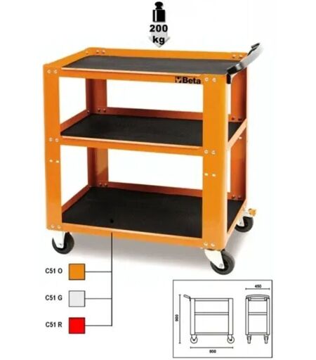 Carrello. " 3 ripiani ricoperti in gomma millerighe antiscivolo " maniglia ergonomica " doppia possibilit di fissaggio del ripiano centrale " quattro ruote 100 mm: 2 fisse e 2 girevoli (una con freno). " capacit di carico statico: 200 kg. (distribuita sui 3 ripiani) Tipologia : Carrello Piano di lavoro : Ricoperto gomma millerighe antiscivolo Portata piano : Max 200 kg ( istribuito su 3 ripiani) Maniglia : Ergonomica Ruote : 100 mm - 2 fisse - 1 girevole - 1 girevole con freno Peso : 21 kg ...