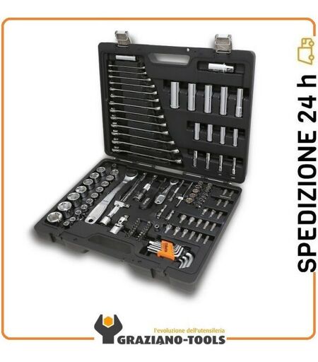 Valigetta porta utensili Beta modello 2046E/C116 realizzata in materiale plastico ad alta resistenza. FOrnita completa di 116 utensili ideali per la manutenzione in occasione di lavorazioni ordinarie o straordinarie. Perfetto per uso professionale. Dimensione della valigetta porta utensili 453 x 375 x 90mm. L'assortimento UNIVERSALE prevede 116 utensili adatti a qualsiasi officina o centro industriale che spaziano da bussole, chiavi a brugola, cricchetti, chiavi combinate, inserti per avvitatore e molto altro. 42C - Set 13 chiavi combinate a forchetta e poligonale cromate Misura: 7 - 8 - 9 - 10 - 11 - 12 - 13 - 14 - 15 - 16 - 17 - 18 - 19 mm 96/SK9 - Set 9 chiavi a brugola Misura: 1,5 - 2 - 2,5 - 3 - 4 - 5 - 6 - 8 - 10 mm C900 - Set 13 bussole esagonali 1/4 Diametro: 4 - 4,5 - 5 - 5,5 - 6 - 7 - 8 - 9 - 10 - 11 - 12 - 13 - 14 mm C900L - Set 8 bussole esagonali lunghe 1/4 Diametro: 6 - 7 - 8 - 9 - 10 - 11 - 12 - 13 mm C900E/55 - Cricchetto reversibile, 1/4 C900/25 - Snodo Easy attacchi ...
