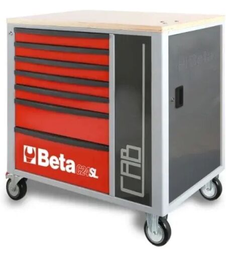 La cassettiera mobile Beta C24SL-CAB è realizzata con 7 cassetti e praticissimo armadietto porta ogetti.I cassetti, montati su guide telescopiche a sfera,sono molto spaziosi con base da 588x367 mm rivestita con tappetini in gomma espansa e altezze differenti, 70 mm (x5), 140 mm (x1) e 210 mm (x1) per poter riporre senza problemi la maggior parte dei propri utensili.La serratura centralizzata frontale vi offre la possibilità di riporre in tutta sicurezza i vostri utensili.La cassettiera Beta C24SL-CAB, montata su 4 ruote da 125 mm, 2 fisse e 2 girevoli con freno per semplificare sia la movimentazione che lo stazionamento.L'armadietto laterale di questa fantastica cassettiera, è dotato di ripiano regolabile in altezza e ulteriore serratura di sicurezza.Il piano di lavoro è realizzato in legno mulistrato con capacità di carico statico che raggiunge i 1.100 kg e predispoto di feri per il montaggio della morsa opzionale Beta 1599f/100.Questa casettiera mobile è predisposta con porta carta ...