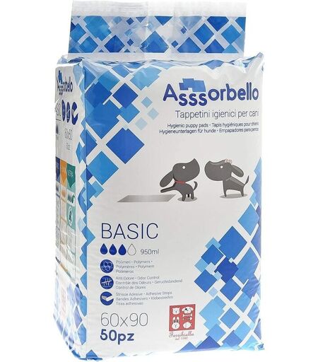 I tappetini igienici Asssorbello per cani sono in cellulosa con polimeri attivi ad alto assorbimento, hanno strisce adesive e attrattive ai ferormoni che invitano il cane a sporcare sopra il tappetino. E' un tappetino igienico super assorbente, ideale per risolvere i problemi igienici dei cani che per motivi di salute, età o altro, sono costretti a vivere per lungo tempo in casa. Lo strato interno è realizzato in cellulosa che grazie al contenuto di polimeri attivi (circa 10g) possiede un alto potere assorbente in grado di trattenere una grande quantità di liquidi. Lo strato esterno, realizzato in materiale plastico, è perfettamente impermeabile. Dimensioni: 60x90 50 Tappetini ...