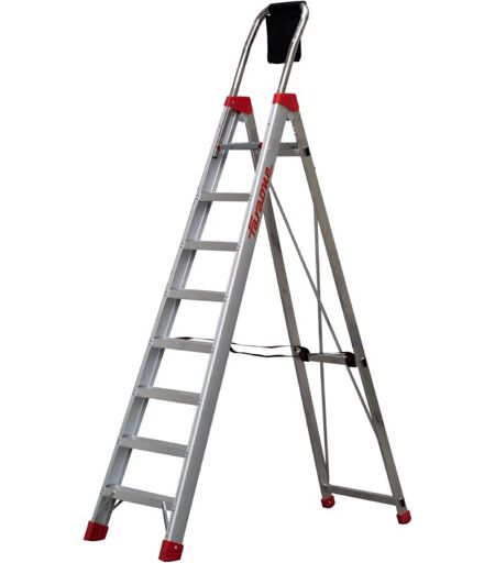 DATI TECNICI: Altezza di lavoro: 375 cm Carico massimo: 150 kg Angolo della scala: 70 gradi Profondità del gradino: 8 cm Dimensioni della piattaforma di lavoro: 27 x 27 cm Realizzato in alluminio Pieghevole Scala monofacciale 8 gradini Scala destinata a lavori professionali di montaggio, manutenzione, assistenza e montaggio. Utile per le faccende domestiche. SCALA LADY8, ALLUMINIO PROFESSIONALE 8 GRADINI La sicurezza dei dipendenti durante il lavoro è garantita da: Gradini e corrimano scanalati e antiscivolo da 8 cm, La parte superiore della scala è rifinita con un arco alto ed ergonomico. Resistenza e stabilità: I longheroni della scala sono realizzati con profili in alluminio aperti e resistenti con una sezione trasversale di 80 x 35 mm. Nell'elemento posteriore sono utilizzati solidi stabilizzatori trasversali. La piattaforma di lavoro è realizzata in lamiera forata spessa. I longheroni in alluminio sono collegati ai gradini tramite rivettatura (utilizzando tecnologia aeronautica ...