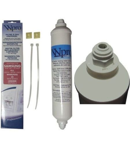 2x Filtro per l'acqua Whirlpool USC100 - WPRO 484000008553 (USC100/1) / 481281718629 (USC100) Filtro acqua universale per frigoriferi americani (side-by-side). Filtro dell'acqua universale WPRO per frigoriferi americani con filtro dell'acqua esterno da posizionare dietro il frigorifero. Questo filtro è conforme alla Direttiva Europea 89/109 ECC. Il filtro per l'acqua USC100 è adatto ai seguenti modelli di frigorifero: Balay: 3F7786A Bosch: KAN58A10; KAN58A40 (../01 - ../08); KAN58A40AU (../01 - ../05); KAN58A40GB (../01 - ../10); KAN58A40J (../01 - ../03); KAN58A50; KAN58A70; KAN58A90; KAN58P90/01; KAN58P90/02; KAN58P90/03; KAN58P90/04; KAN58P90/05; KAN58P90/06; KAN58P90/07; Codice articolo: KAN58P90/08; KAN58P90/09; KAN58P95/01;KAN58xxx; KAN60A40 (../01 - ../08); KAN60A40J (../01 - ../03); KAN60A40NE (../01 - ../05) Il Dietrich: DKA866M; DKA866X; DKA869X Electrolux: 4055050316 / S56090XNS1 Gorenje: NRS85557E Hotpoint: FFU00P Kuppersbusch: KE590-1-2T; KEL580-1-2T Neff: K3940X6-e; ...
