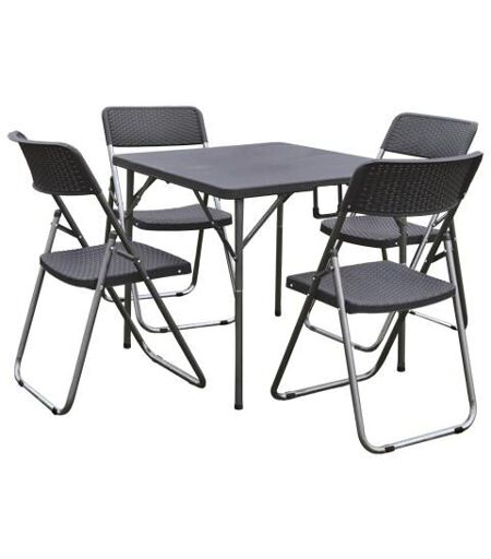 Set Garden Ecco Fatto antracite Set composto da 1 tavolo + 4 sedie Tavolo: Stuttura pieghevole in acciaio, piano in polipropilene Dimensione 80x80xH73 cm. - Sedie: Struttura in acciaio, seduta e schienale in polipropilene Dimensione 46x53xH84 cm. ...