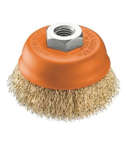 Spazzole Brixo a Tazza In acciaio ottonato ondulato. Fili Ø 0.30 mm. - Attacco M14. Ideale per pulire, satinare, sbavare, rimuovere ruggine e scorie, sverniciare. Ø 100 mm. - Max 8500 Rpm ...