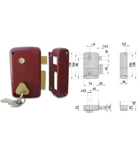 Serratura verniciata rossa applicare legno Cilindro interno - Catenaccio e scrocco Quadro maniglia passante Misura scatola mm 74x128 - Entrata mm 45 Cilindro 02106-00-0 3 chiavi ...