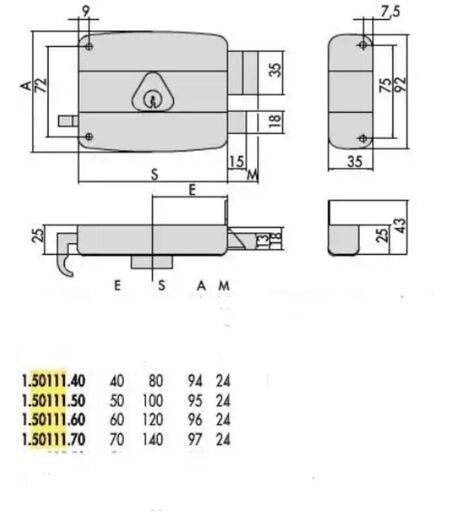 Serratura da applicare a cilindro esterno e pomolo interno. Scatola e bocchetta in acciaio verniciato color rosso amaranto, scrocco e catenaccio in ottone, tirante e pomolo in ottone, entrate disponibili mm.40-50-60-70, versione destra (1) o sinistra (2). Cilindro esterno tondo mm.25, lunghezza standard mm.50. ...