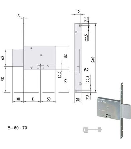 Serratura zincata infilare ferro Catenaccio acciaio zincato Doppia mappa 4 mandate Ambidestra Scatola 82 - Frontale 25x240 1 chiave - Cifratura unica KA ...
