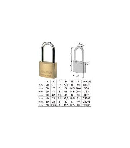 mm.20 (art.22011200) corpo monoblocco in ottone smerigliato, arco in acciaio carbonitrurato nichelato, dotazione 2 chiavi Pezzi per confezione primaria: 12,0 Larghezza 9,1 Lunghezza 5,7 Altezza 5,4 Peso 0,487 ...