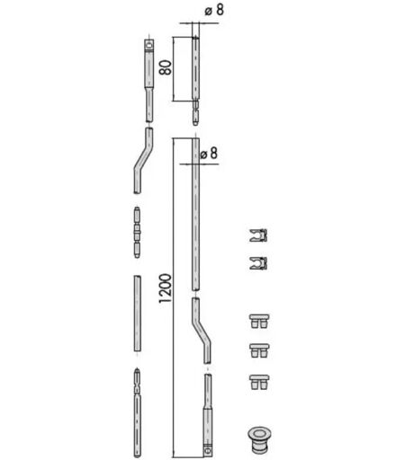 Coppia aste interne zancate per chiusure supplementari per serrature CISA infilate. Il set comprende: 2 aste d.8 mm, 2 puntali d.8 mm, bocchetta a pavimento, spinotto di giunzione, 2 pinze guida aste, boccole antirumore. ...