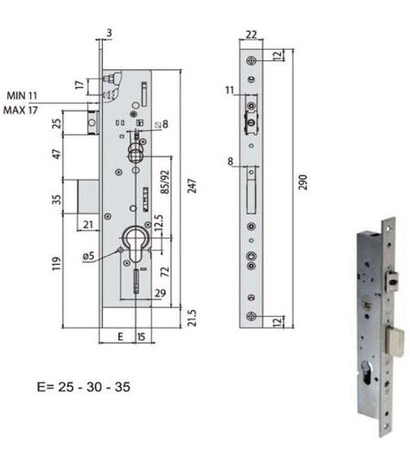 Serratura montanti alluminio infilare Frontale inox - Catenaccio Scrocco reversibile regolabile mm 11/17 Ambidestra Cilindro non incluso Scatola 247 - Frontale 22x290 ...