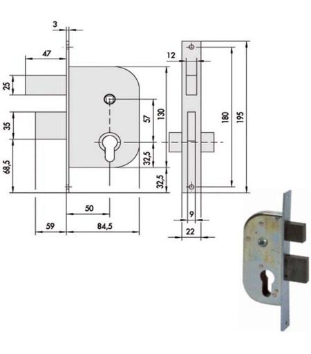 Serratura zincata infilare ferro Scrocco azionato da chiave e maniglia Catenaccio Quadro maniglia passante Ambidestra Cilindro non incluso Scatola 130 Frontale 22x195 ...