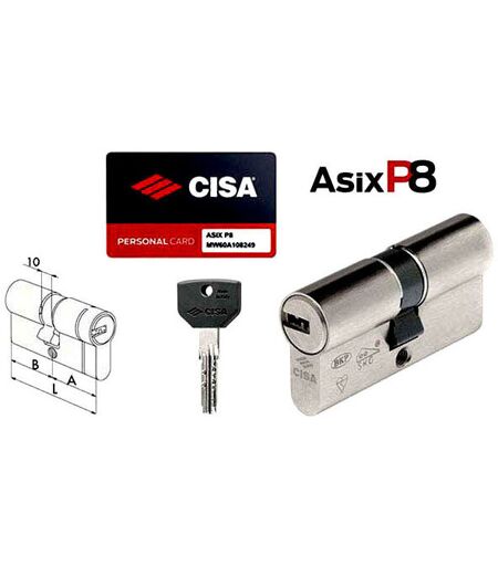 Cilindro ottone nichelato frizionato Utilizzo simultaneo 2 chiavi Sistema a 6 perni attivi + 2 passivi Perni e controperni acciaio carbonitrurato Camma acciaio sinterizzato Molle bronzo fosforoso e acciaio Protezione antitrapano BKP resistente Bumping brevetto depositato 3 chiavi Asix 00670-10-0 cod.85663 Duplicazione chiavi con Personal Card ...
