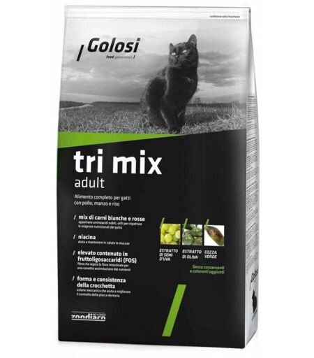 Golosi Tri Mix è un alimento estremamente appetibile grazie al mix di carni bianche e rosse che rispetta la natura e le esigenze fisiologiche del gatto apportando preziosi aminoacidi, utili a mantenere il corretto tono muscolare, per il massimo della vitalità. Composizione: Carni e derivati (Pollo 28%, Manzo 6%), Cereali (Riso 4%), Oli e grassi (Grasso di pollo 4,6%), Sottoprodotti di origine vegetale (Cellulosa Arbocel® 0,5%, Inulina di cicoria - fonte di FOS – 0,1%), Lieviti (Lievito di birra 0,5%), Sostanze minerali, Molluschi e crostacei (Cozza verde sgusciata in polvere – Perna canaliculus 0,005%). ...