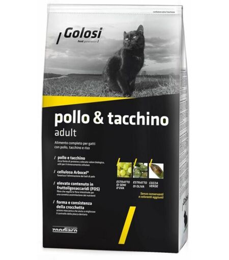 Golosi Pollo & Tacchino è un alimento estremamente appetibile grazie al mix di carni bianche che rispetta la natura e le esigenze fisiologiche del gatto apportando preziose proteine a elevato valore biologico, utili per il rinnovamento cellulare Composizione: Carni e derivati (Pollo e Tacchino 28%), Cereali (Riso 4%), Oli e grassi (Grasso di pollo 4,6%), Sottoprodotti di origine vegetale (Cellulosa Arbocel® 0,5%, Inulina di cicoria – fonte di FOS – 0,1%), Lieviti (Lievito di birra 0,5%), Sostanze minerali, Molluschi e crostacei (Cozza verde sgusciata in polvere – Perna canaliculus – 0,005%). ...