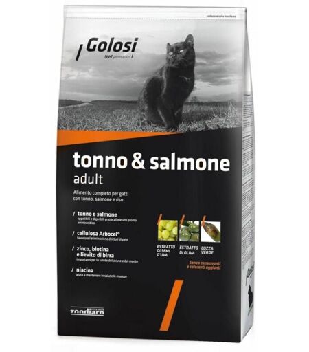 Golosi Tonno & Salmone è un alimento appetibile e digeribile grazie all’inclusione di pesce, fonte proteica con elevato profilo aminoacidico. Composizione: Carni e derivati, Cereali (Riso 4%), Pesci e sottoprodotti dei pesci (Tonno 8%, Salmone 8%), Oli e grassi (Grasso di pollo 5%), Sottoprodotti di origine vegetale (Cellulosa Arbocel® 0,5%, Inulina di cicoria – fonte di FOS – 0,1%), Lieviti (Lievito di birra 0,5%), Sostanze minerali, Molluschi e crostacei (Cozza verde sgusciata in polvere – Perna canaliculus - 0,005%). ...