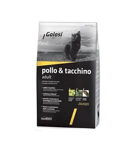 Golosi Pollo & Tacchino è un alimento estremamente appetibile grazie al mix di carni bianche che rispetta la natura e le esigenze fisiologiche del gatto apportando preziose proteine a elevato val ... Golosi Pollo & Tacchino è un alimento estremamente appetibile grazie al mix di carni bianche che rispetta la natura e le esigenze fisiologiche del gatto apportando preziose proteine a elevato valore biologico, Golosi Pollo & Tacchino è un alimento estremamente appetibile grazie al mix di carni bianche che rispetta la natura e le esigenze fisiologiche del gatto apportando preziose proteine a elevato valore biologico, utili per il rinnovamento cellulare. La forma e la consistenza della crocchetta contribuiscono alla rimozione meccanica della placca mentre l’elevato contenuto in prebiotici FOS favorisce la corretta assimilazione dei nutrienti. L’ampia integrazione vitaminico-minerale contribuisce a limitare i processi di ossidazione, per un gusto a tutto benessere. Livelli contenuti di ...