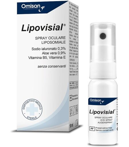 Lipovisial - Descrizione Soluzione oftalmica spray senza conservanti, sterile, reidratante e lenitiva, con liposomi, sodio ialuronato, aloe vera, vitamina B5 e vitamina E. Coadiuvante nel trattamento della secchezza oculare, degli stati irritativi ed infiammatori dell'occhio e dell'area perioculare… ...
