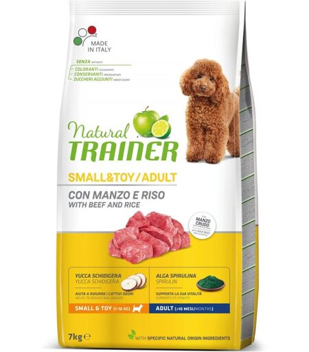 Alimento Per Cani Adulti Taglia Piccola Alimento completo per cani adulti (>8 mesi) di piccola e piccolissima taglia. La yucca schidigera contribuisce a ridurre l'odore delle feci limitando le fermentazioni proteiche intestinali. L'alga spirulina aiuta a supportare la vitalità dell'organismo. La vitamina C aiuta a prevenire la formazione di tartaro e alito cattivo. Modalità d'uso Introdurre l'alimento gradualmente, servito tale e quale oppure leggermente inumidito con acqua tiepida. Si può abbinare le crocchette all’alimento umido corrispondente, ricordando di aggiustare la razione giornaliera. Lasciare sempre a disposizione una ciotola di acqua fresca e pulita. Peso del cane (kg) Quantità giornaliera raccomandata 1 30 g 2 45 ...