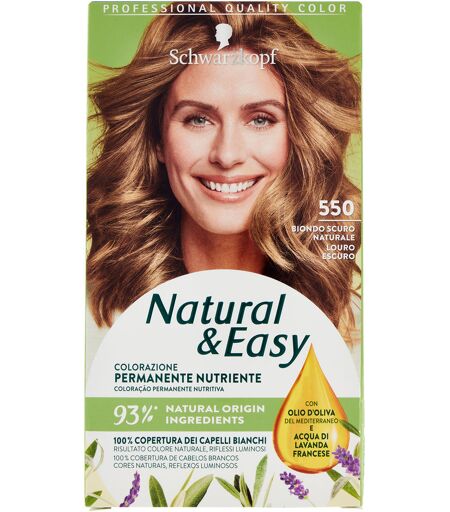 Colorazione permanente nutriente Risultato colore & ingredienti di origine naturale Il marchio Schwarzkopf Natural & Easy è amato per la sua affidabilità e per un risultato colore naturale, ricco di riflessi. Con il 87%* di ingredienti di origine naturale (* inclusa l'acqua), Natural & Easy esalta il colore naturale dei capelli donando luminosità. I restanti ingredienti, che costituiscono il 13% della formula, garantiscono il risultato colore. La nostra crema colorante nutriente con acqua di Lavanda Francese e tre tonalità colore pre-miscelate dona un risultato colore naturale, ricco di riflessi luminosi e il 100% di copertura dei capelli bianchi. Perfetto nutrimento Il Balsamo Nutriente con Olio d'Oliva del Mediterraneo è composto dal 97%* di ingredienti di origine naturale (*inclusa l'acqua) e dona nutrimento e morbidezza ai capelli per un colore luminoso. Le nostre promesse Utilizziamo ogni volta possibile materiali riciclati e riciclabili Ingredients origin 87%* Origine naturale - Olea Europea (Olive) Fruit Oil, Lavender Water, Emollient & Humectant Agent, Aqua, Consistence Regulator L'Olio d'Oliva, di origine naturale, può aiutare a rendere i capelli più morbidi. * inclusa l'acqua Il restante 13%** - Anionic Surfactant, Nonionic Surfactant, Emulsifying Agent, Thickener, Solvent, Surfactant Agent, Cationic Surfactant, Chelating Agent, Antioxidants, Cationic Polymers, Pigments, Perfume, Preservative, PH Agent, Stabilizing Agent, Oxidizing Agent, Alkaline Agent Ingredienti necessari per garantire il risultato colore (pigmenti coloranti) ** non di origine naturale Per l'elenco degli ingredienti dettagliati consultare il fondo di questa confezione. ...