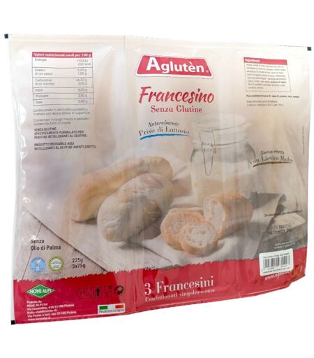 Agluten - FRANCESINO - Descrizione Sfilatino in pratiche monoporzioni. - Ingredienti Acqua, amido di mais, farina di riso, olio extravergine di oliva 5%, zucchero, lievito madre essiccato 3% (farina di riso, farina di mais, farina di quinoa amido di mais), addensanti: farina di semi di guar – idros… ...
