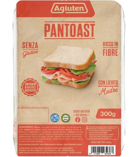 Agluten PANTOAST Descrizione Pancarrè bianco. Ingredienti Acqua, amido di mais, farina di riso, olio di girasole alto oleico, lievito madre essiccato 2% (farina di mais, amido di mais, farina di quinoa, farina di riso); addensanti: farina di semi di guar - idrossipropilmetilcellulosa; sale iodato, proteine di riso, fibra di psyllium, aroma. Senza glutine. Caratteristiche nutrizionali Valori medi per 100 g Energia 1.041 kJ/247 kcal Grassi di cui acidi grassi saturi 5 g 0,55 g Carboidrati di cui zuccheri 44,5 g 3,5 g Fibre 6 g Proteine 3 g Sale 1,4 g Conservazione Conservare a temperatura ambiente. Validità a confezionamento integro: 6 mesi. Formato Confezione da 300 g. ...