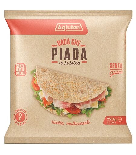 Agluten BADA CHE PIADA la rustica Descrizione Prodotto da forno senza glutine specificamente formulato per persone intolleranti al glutine. Ingredienti Miscela base [amido di maismiscela di farine di cereali 10%, riso venere, sorgo, teff rosso, grano saraceno, miscela di farine di semi di lino, chia (Salvia hispanica); fibre vegetali: psyllium, inulina; fruttosio; addensanti: gomma di guar, idrossipropilmetilcellulosa; farina di mais tostata, estratto di mela], acqua, margarina vegetale (grassi vegetali: cocco; oli vegetali: girasole; acqua), olio extra vergine di oliva, sale, sciroppo di riso (farina di riso, acqua), lievito di birra, latte senza lattosio; agenti lievitanti: difosfato disodico, bcarbonato di sodio; amido di mais; conservante: potassio sorbato. Può contenere tracce di soia, uova, frutta a guscio, senape. Senza glutine. Caratteristiche nutrizionali Valori medi per 100 g Energia 1.220 kJ/301 kcal Grassi di cui acidi grassi saturi 7,20 g 4,20 g Carboidrati di cui zuccheri 57,00 g 6,10 g Fibre 2,30 g Proteine 1,50 g Sale 1,57 g Modalità d'uso Riscaldare su una padella antiaderente preriscaldata, 1 minuto per lato. Conservazione Conservare in luogo fresco e asciutto. Validità a confezionamento integro: 5 mesi. Validità post-apertura: 2 giorni, a una temperatura compresa tra 1°C e 4°C. Formato Confezione da 220 g. ...
