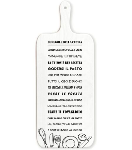 Tagliere decorativo Light White con manico nella colorazione di fondo Bianca, una nuova idea regalo decorativa per la casa o da cucina con frasi a tema che descrivono i comportamenti da tenere in cucina, l'amore per la famiglia e caratteristiche di buon auspicio per i familiari. Da regalare in qualsiasi occasione ad amici o familiari, un dono per una persona speciale. Un souvenir, gadget, bomboniere o segnaposto o regalo artigianale, ecologico frasi che si adattano ad ogni evento, compleanno, onomastico, natale, pasqua e ricorrenze speciali. La struttura del tagliere da esposizione e' in legno multistrato di betulla con uno spessore di 5 mm, ideale da appendere sulle pareti della tua cucina o come decorazione per la casa. E' realizzato completamente in Italia. Le dimensioni del tagliere sono: 15x37 cm. ...