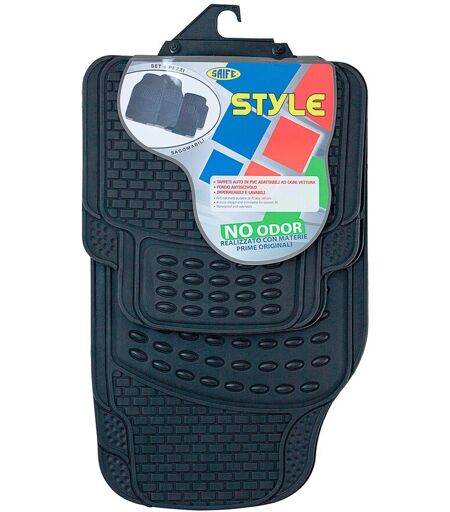 Set tappeti per auto con disegno a rilievo per trattenere acqua e sporco. 4 pezzi. Retro puntinato per una migliore adesione al fondo. Composizione PVC, realizzato con materie prime originali. Resistente e inodore. Modello universale adatto a ogni tipo di auto, sagomabile. Misura ingombro tappeto anteriore: 69x43 cm. ...