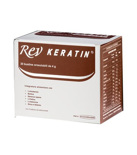 Rev Keratin BUSTINE Integratore alimentare cheratotrofico per capelli e unghie in bustine a base dimirtillo. Non contiene conservanti, allergeni e glutine. Ingredienti Serenoa repens; betasitosterolo; amminoacidi; mirtillo. Modalità d'uso Assumere 1 bustina al giorno. Avvertenze Non superare la dose giornaliera raccomandata. Tenere fuori dalla portata dei bambini al di sotto dei tre anni di età. Gli integratori non vanno intesi come sostituti di una dieta variata. Per donne in gravidanza o in allattamento e bambini si raccomanda di sentire il pareredel medico. Formato Confezione da 30 bustine. Cod. KERATIN ...