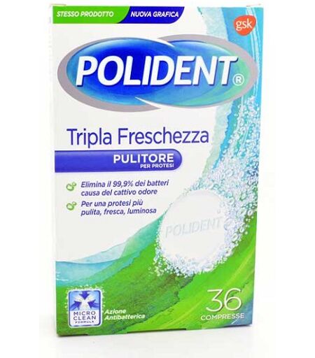 POLIDENT Tripla Freschezza PULITORE Elimina il 99,9% dei batteri causa del cattivo odore Per una protesi più pulita, fresca, luminosa Pulizia profonda per ripristinare il bianco originale della protesi. Elimina la maggior parte dei batteri causa dei cattivi odori. Se utilizzato seguendo le istruzioni, contribuisce a ridurre la placca ed elimina le macchie difficili per ripristinare il bianco originale della protesi. Delicato sui materiali della protesi. Grazie alla sua formula alla menta lascia una sensazione di freschezza e pulito che dura tutto il giorno. Eliminano la maggior parte dei batteri responsabili dei cattivi odori, eliminano le macchie più tenaci e contribuiscono a ridurre l'accumulo di placca, lasciando la protesi pulita, fresca e luminosa ogni giorno. Le compresse presentano una formula non abrasiva, per cui puliscono la protesi senza graffiarla, lasciando meno spazio per la proliferazione di batteri e altri microrganismi. Modalità d'utilizzo Utilizzare una compressa in acqua tiepida (non calda) sufficiente a coprire completamente la protesi. Lasciare a bagno tutta la notte. Spazzolare la protesi con la soluzione servendosi di uno spazzolino a setole morbide. Sciacquare con acqua corrente. Scartare la soluzione residua immediatamente dopo l'uso. Formato Confezione da 36 compresse. ...