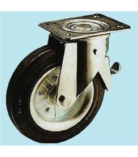 Descrizione Supporto a piastra girevole, zincato, con dispositivo di bloccaggio ruota a pedale; ruota in gomma nera con flange in acciaio. Ruota da 80mm portata massima 75kg ...