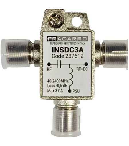 Inseritore di alimentazione con connettori F femmina e massima corrente di alimentazione 3A Viene utilizzato per alimentare a monte una serie di multiswitch SCD2 in cascata; il passaggio di corrente tra le porte dei multiswitch permette di alimentare anche gli LNB. Può essere utilizzato con qualsiasi tipo di alimentatore, ad esempio PSU1430F o PSU1830F. Bassa perdita di inserzione. Funzionamento su larga banda TV e Satellite (40MHz – 2400MHz). Dimensioni compatte. Prodotto eccellente, realizzato con materiali di alta qualita' e pensato per durare nel tempo. ...