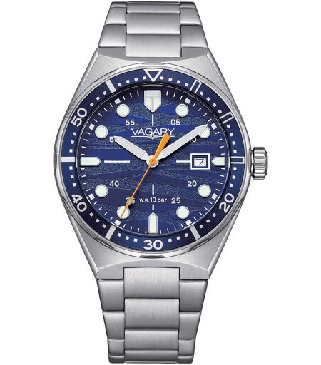 Orologio Solo Tempo Da Uomo Di Vagary Della Collezione Aqua 39. Orologio Con Cassa In Acciaio Con Fondo Serrato A Vite Diametro Cassa 39 Mm E Quadrante Blue Con Iindici Applicati. . Orologio Con Bracciale In Acciaio Integrato Con Chiusura A Pulsante. La ...