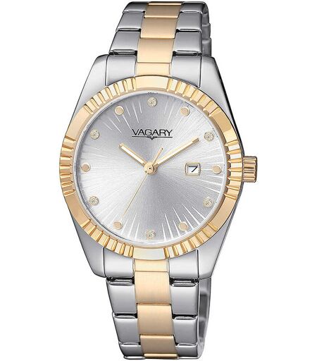 Orologio Solo Tempo Da Donna Di Vagary, Della Collezione Timeless Lady. La Cassa E Il Bracciale Sono In Acciaio Bicolore. Il Diametro Della Cassa È Di 32mm. Il Quandrante È Chiaro Con Cristalli Applicati. Il Bracciale È In In Acciaio Bicolore Con ...