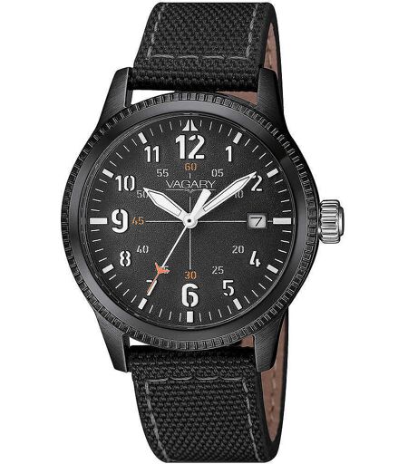 Orologio Solo Tempo Da Uomo Di Vagary Della Collezione Flyboy. Modello Con Cassa In Acciaio Nero Del Diametro Di 36 Mm, Quadrante Con Indici Numerici E Cinturino In Tessuto Tecnico Di Colore Nero E Fibbia Ad Ardiglione. Orologio Dotato Di Movimento Al ...
