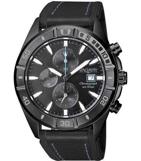Orologio Cronografo Da Uomo Di Vagary Della Collezione Acqua39. Modello Con Cassa In Acciaio Nero Del Diametro Di 42 Mm E Quadrante Con Indici A Tacche. Il Bracciale È Realizzato In Pelle Nera Con Chiusura A Fibbia. Orologio Con Resistenza All'Acqua Di ...