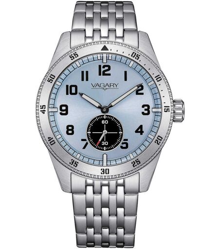 Orologio Da Uomo Di Vagary Della Collezione Flyboy Small Second. Orologio Con Cassa In Acciaio Con Fondo Serrato A Vite, Diametro Cassa 40mm E Vetro Minerale. Orologio Con Quadrante Azzurro Ghiaccio Con Indici E Numeri Arabi E Piccoli Secondi A Ore Sei E ...
