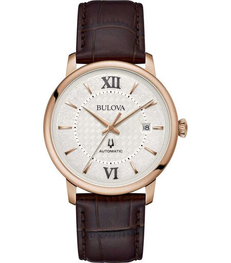 Orologio Solo Tempo Da Uomo Di Bulova Della Collezione Hudson. Il Materiale Della Cassa È Acciaio Ipoallergenico Oro Rosa Di Misura 39 Mm. Il Materiale Del Cinturino È Pelle Di Colore Marrone. La Chiusura Del Cinturino È Ardiglione. Gli Indici Sono A ...