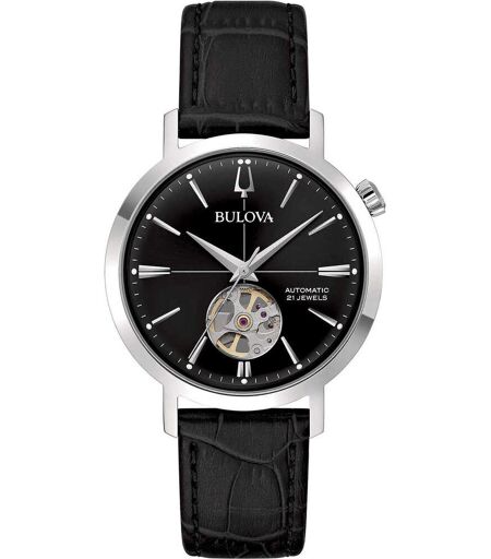 Orologio Solo Tempo Da Uomo Di Bulova Della Collezione Aerojet. Il Materiale Della Cassa È Acciaio Di Misura 38 Mm. Il Materiale Del Cinturino È Pelle Di Colore Nero. La Chiusura Del Cinturino È Deployante. Gli Indici Sono A Tacche. Il Movimento È ...