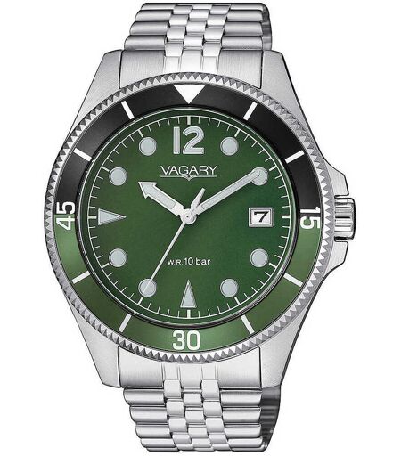 Orologio Solo Tempo Dauomo Di Vagary Della Collezione Di Aqua 39. Cassa In Acciao Con Fondo Serrato A Vite Diametro Cassa 41mm , Quadrante Verde Con Indicie Sfere Chiari E Ghiera In Alluminio Verde E Nero, Bracciale In Acciao Integrato Con Chiusura A ...