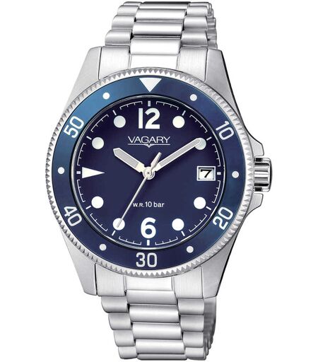 Orologio Solo Tempo Da Uomo Di Vagary By Citizen Della Collezione Aqua 39. Bracciale Realizzato In Acciaio Integrato Con Chiusura A Pulsante. Orologio Con Quadrante Di Colore Blu Con Indici E Sfere Chiari. La Cassa È Realizzata In Acciaio Con Fondo ...