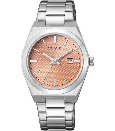Orologio Solo Tempo Da Donna Di Vagary Della Collezione Timeless. Con Cassa In Acciaio Diametro Cassa 32mm. Orologio Con Quadrante Salmone Lavorato Guilloscé Con Indici E Lancette Di Color Acciaio. Ha Un Bracciale In Acciaio Con Chiusura A Pulsante. La ...