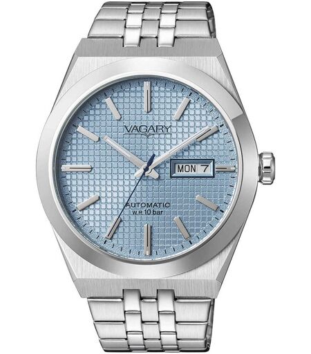 Orologio Solo Tempo Automatico Da Uomo Di Vagary Della Collezione Timeless. Con Cassa In Acciaio Diametro Cassa 40mm Con Oblo' Trasparente . Orologio Con Quadrante Azzurro Ghiaccio Lavorato Guilloché Con Indici E Lancette Di Color Acciaio. Ha Un ...