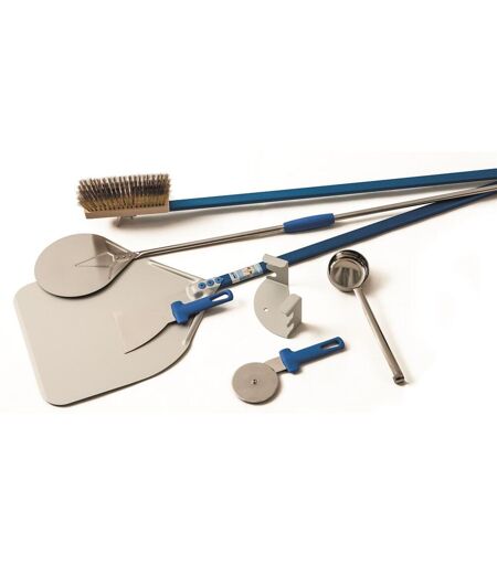 Composizione Il set pizza professionale di GiMetal è comporto da: Pala pizza tonda in alluminio anodizzato diam. 33 cm con manico 1.50 mt Palettino pizza inox diam. 20 cm con manico 1.50 mt Spazzola orientabile setole in ottone 20x6,6 cm, con raschietto Appendi pala a muro in alluminio. Rotella pizza smontabile, lama inox riaff. diam 10 cm, manico non ricambiabile Spatola triangolare inox 10x9 cm con manico non ricambiabile Mestolo dosatore inox. Capacità 170 gr. ...